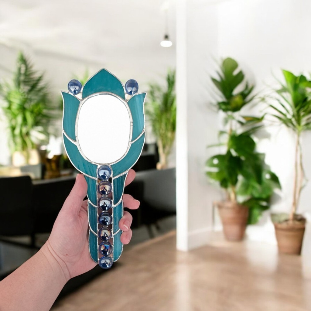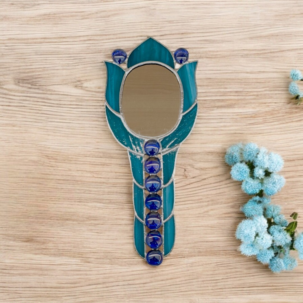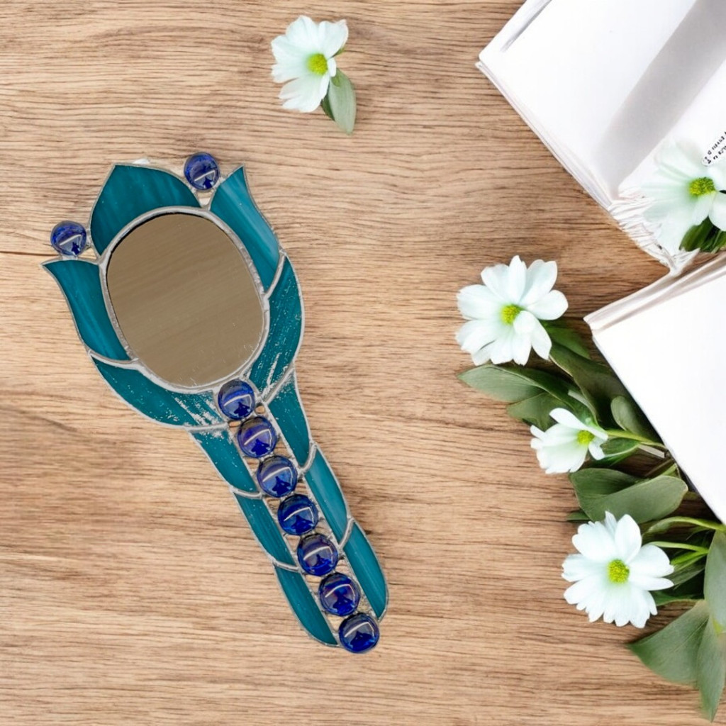 A kézitükörben lévő üveggyöngyök csillogása eleganciát sugároz, hozzáadva egy kis örömöt mindennapjaidhoz. Tiffany technikával készítettem, tehát minden egyes darab egyedi, kézzel készült alkotás.